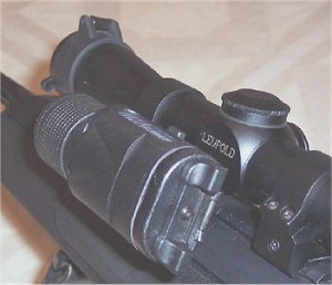 The "Leopard Light" is a combination of a special adapter that mounts to the UIT rail under the forearm of the Steyr Scout along with a Sure-Fire 3P (which works best) or 6P light. The adapter is STANAG 1913 compliant and uses standard "Weaver" type rings to hold the light or other accessories (use your imagination). With the mount in place there may be interference with the bipod and the mount knob and the sling may not be useable. For best results you want the narrow locking knob style Weaver ring, or any ring that is only that wide at the base. Position the mount far enough aft that you can get the sling swivel on and off without interference. At that point, you should have bipod clearance. If not, move the light mount aft in small steps until you do.